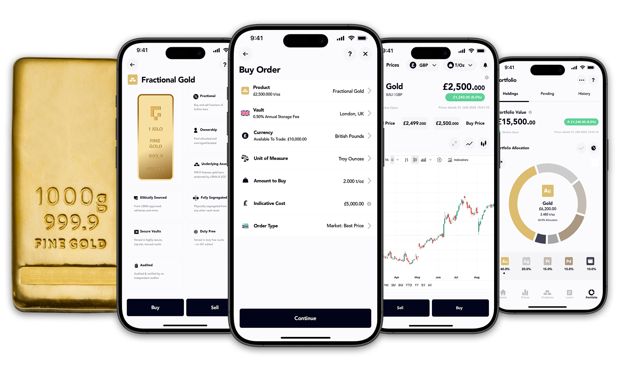 Trade fractional amounts of ethically sourced, investment-grade bullion bars from LBMA-approved refineries, securely vaulted in insured, independently audited, top-tier institutional vaults.
